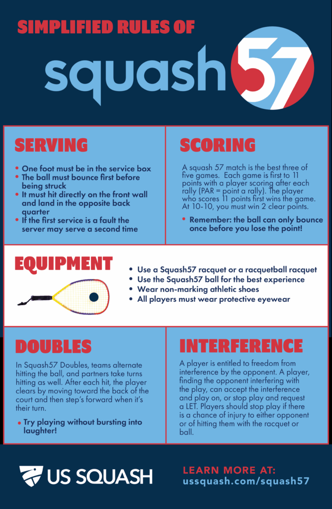 Squash 57 is a lower impact variant of squash played with slightly different rules and a larger (57mm diameter) ball and modified racket. The livelier ball allows for added time to reach your opponent’s shot and means Squash 57 doesn’t require the same intense deep lunging movement of squash that can be taxing on the knees, hips, and feet. Squash 57 is ideal for older players or those with less racket sport experience and provides a great workout in a social setting.